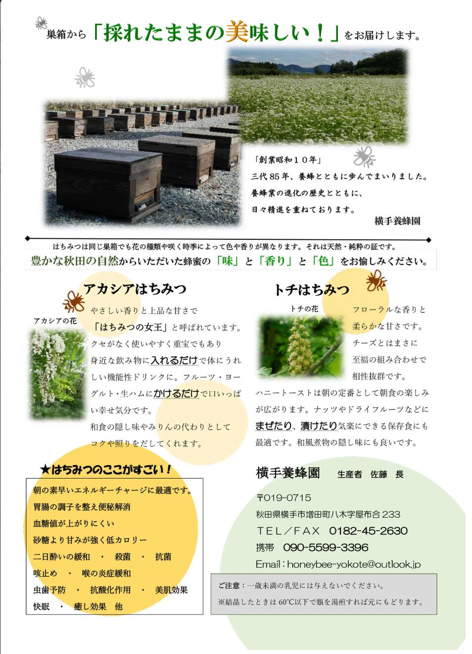 当園の百花蜂蜜はトチ、リンゴ、山桜、藤、イワシ花、タンポポ等が入った春の里山の一番蜜。